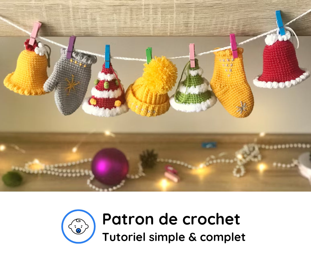 Le kit de patrons de la guirlande de Noël comprend les modèles suivants au format PDF : le chapeau à pompon, la moufle, le bas de Noël, le flocon de neige, la cloche jaune, la cloche rouge, le sapin rouge et le sapin vert. Chaque modèle est accompagné de photos détaillées et de tutoriels vidéo pour faciliter la réalisation de votre projet de crochet.