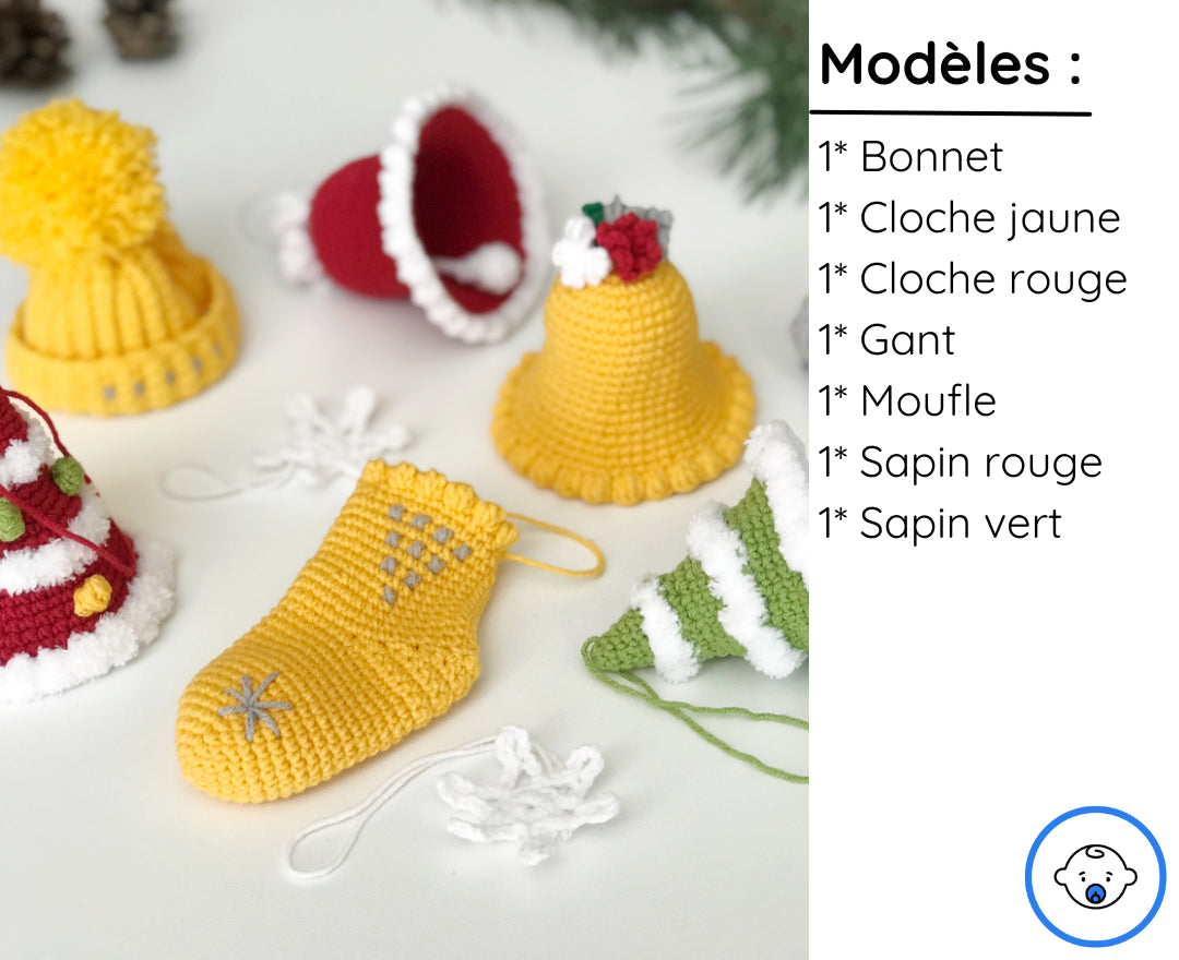 Contenu des modèles : Bonnet, Cloche jaune, Cloche rouge, Gant, Moufle, Sapin rouge, Sapin vert