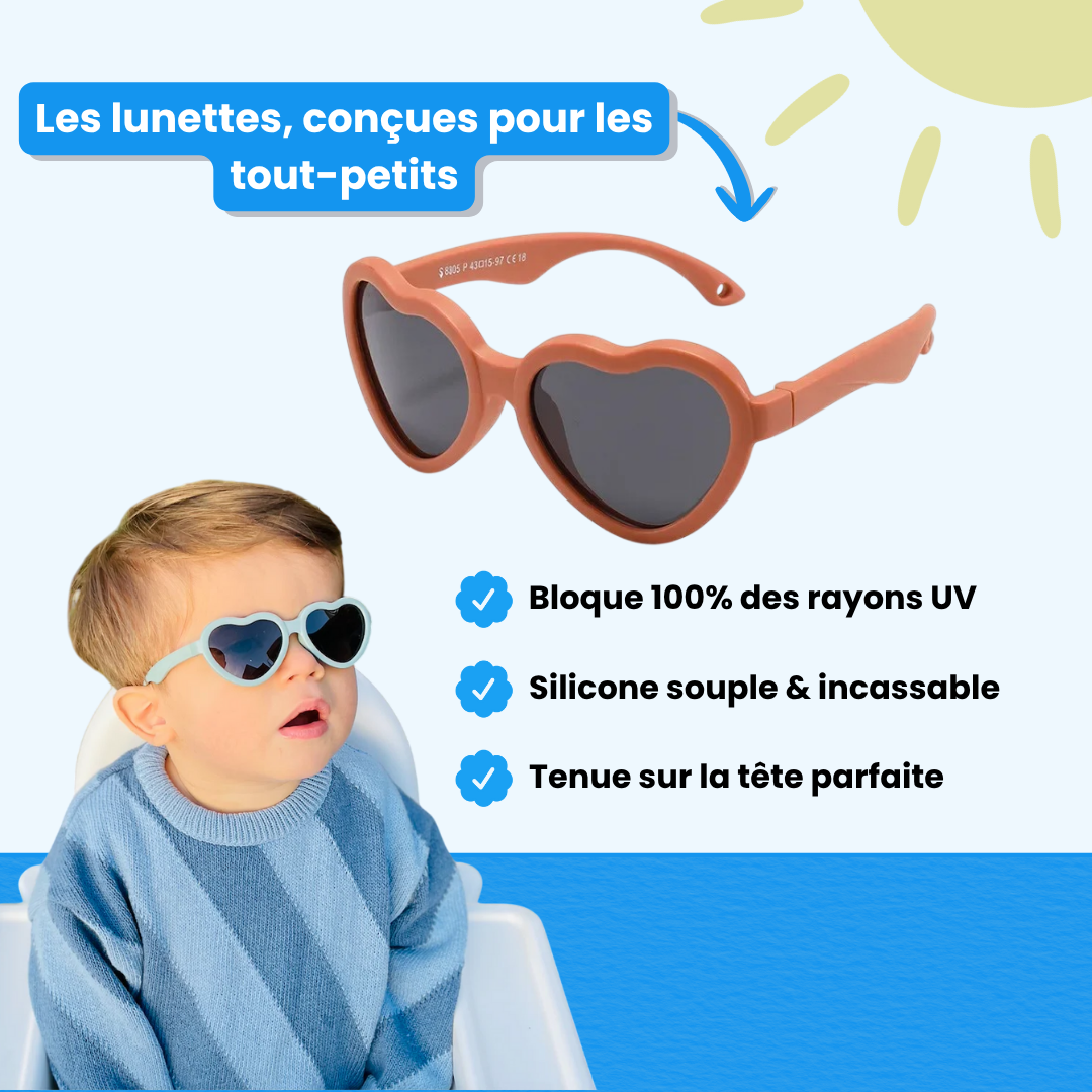 Ces lunettes conviennent aux enfants de 0 à 3 ans. Grâce à leur monture souple et leur bandeau ajustable, elles s’adaptent parfaitement aux petits visages. Elles sont donc idéales pour tous les bébés, dès les premières expositions au soleil.