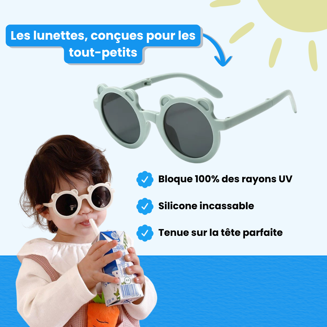 Avec leur monture pliable et leur format compact, ces lunettes se glissent facilement dans un sac ou une poche pour vous accompagner partout. Légères et bien ajustées, elles tiennent parfaitement en place sans sangle. Leur design "petit ourson" ajoute une touche craquante, pour allier style et protection solaire à chaque sortie.